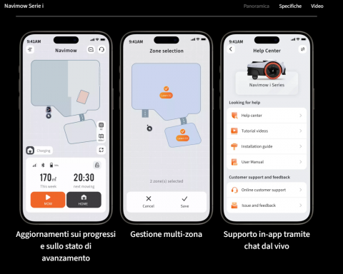 - Sistema di navigazione intelligente RTK (si muove nel giardino grazie entro l'area mappata sfruttando il GPS e il sistema RTK), VisionFence integrato. Grazie al sistema VisionFence avanzato con IA, Navimow i può identificare facilmente aree non erbose ed eseguire una navigazione precisa attorno agli ostacoli comuni. L'illuminazione della telecamera abilita la funzione "Taglio notturno", consentendo al Navimow i di navigare in sicurezza anche di notte.
