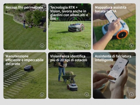 E' un rasaerba robot autonomo che non richiede l'installazione di fili perimetrali: si muove nel giardino utilizzando la tecnologia RTK (su base GPS) e il sistema digitale di riconoscimento ostacoli VISIONFENCE.